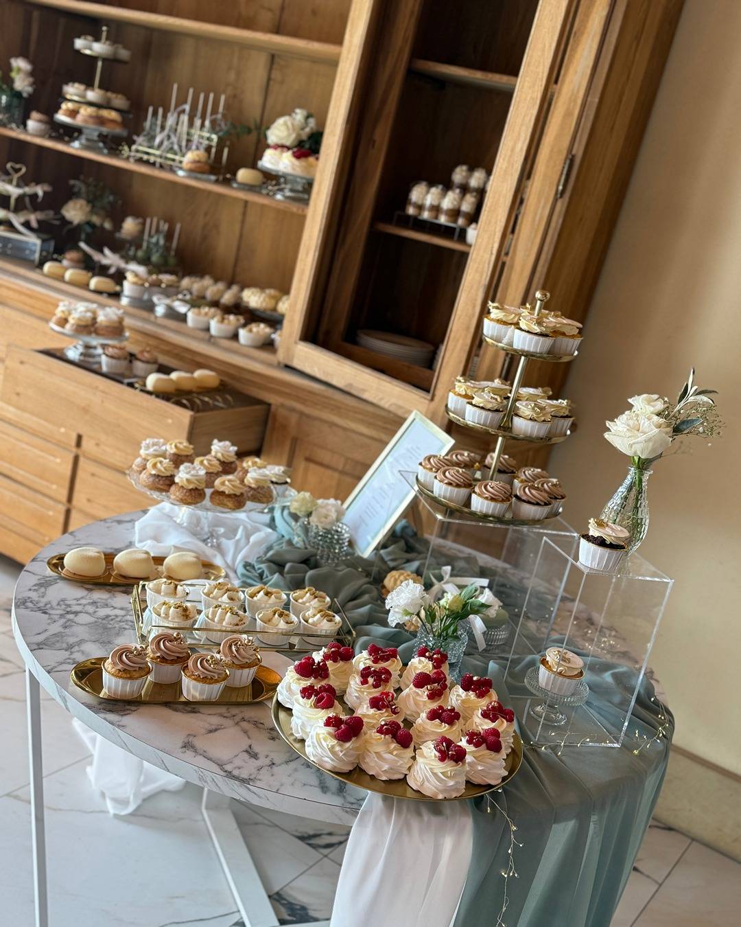 Nasz pyszny bufet traktujemy jak dekoracje sali. Zapewniamy pełną oprawę wizualną słodkiego stoiska - Patery, standy, staranny dobór naczyń. Wszystko by wpasować się w motyw waszego przyjęcia.